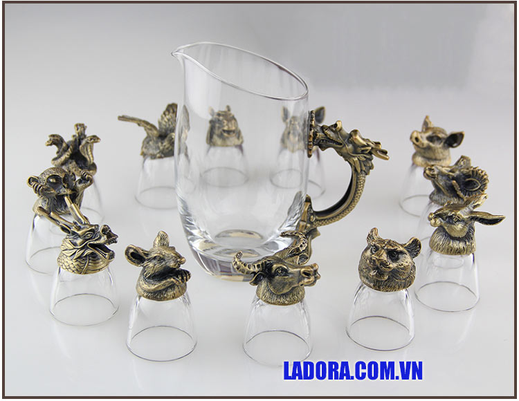 Món quà đầu tiên mà chúng tôi gợi ý là bộ ly rượu 12 con giáp. Ly rượu và vật dụng quen thuộc, cần thiết của mỗi gia đình nhất là khi năm mới gần kề. Điểm độc đáo của bộ ly này là xoay quanh một chiếc ly lớn, 12 chiếc ly nhỏ hơn mô phỏng lại hình ảnh 12 con giáp rất tinh tế. Chất liệu thủy tinh cao cấp cùng đồng mạ vàng càng tôn lên vẻ sang trọng.