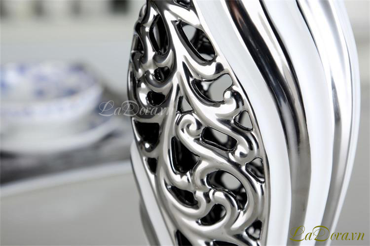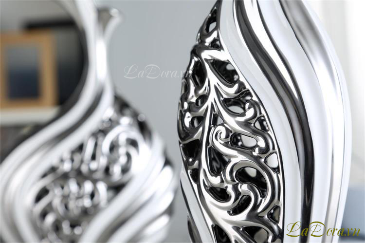 Cặp bình gốm BG024 vẻ ngoài được mạ bạc sáng bóng tạo nên một sự sang trọng và nổi bật khi trang trí. Từng đường nét uốn lượn mềm mại được thể hiện dọc theo thân bình. Điều này đã thể hiện lên sự kỳ công tỷ mỷ của những người nghệ nhân tài ba.