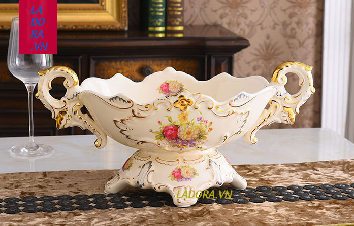 Đĩa khay đựng trái cây là sản phẩm chính trong bộ đồ gốm sứ bày trí bàn ăn. Khay đựng hoa quả trái cây với những đường nét hoa văn được vẽ thủ công rất mỹ miều và tinh xảo. Từng đường nét đều được vẽ vàng cao cấp càng làm cho chiếc đĩa sứ trở nên sang trọng và mang đậm chất phong cách tân cổ điển.