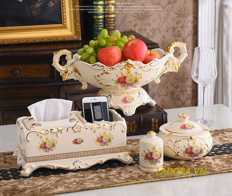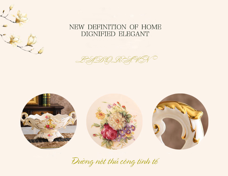 Mời quý khách thưởng lãm mẫu bộ đồ gốm sứ cao cấp trang trí bàn ăn đẹp tại Shop decor nhà đẹp Ladora. Bộ đồ mang phong cách tân cổ điển châu Âu quý phái và sang trọng. Bộ đồ với chất liệu gốm sứ được nung ở nhiệt độ cao tạo thành sản phẩm cao cấp và chất lượng. Bộ đồ có thể trang trí trên bàn ăn cũng như không gian bàn phòng khách.