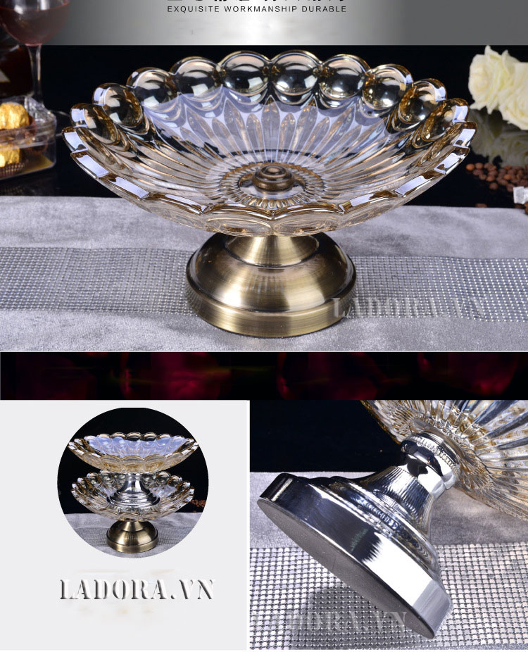 Đĩa thủy tinh pha lê tại Ladora Shop có chân đế được mạ bạc, gồm hai màu: Màu bạc và màu đồng.
