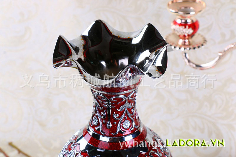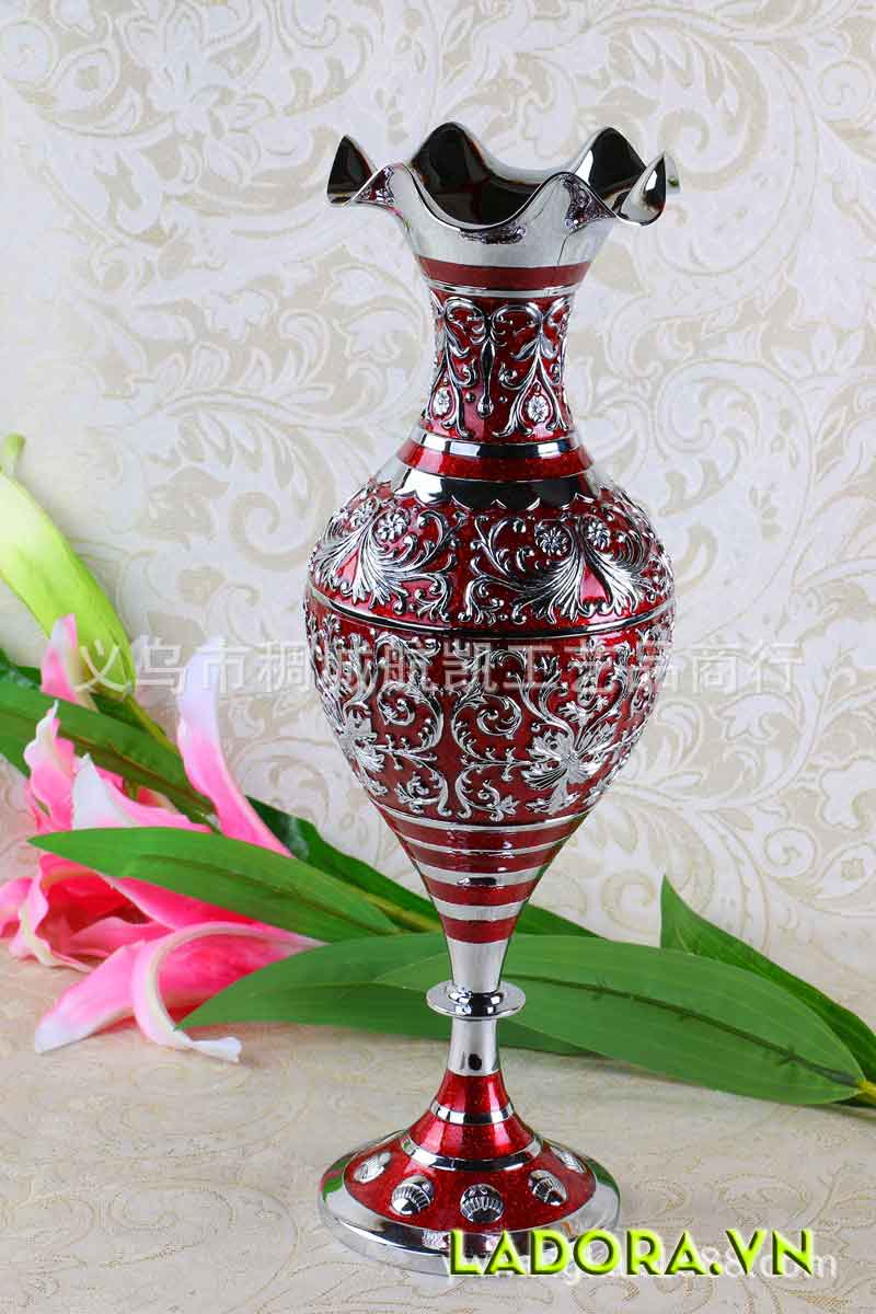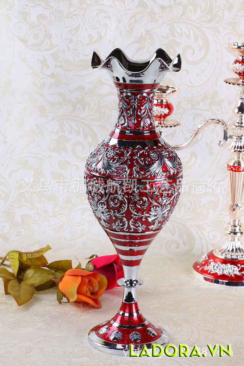 Từng đường nét hết sức tinh tế với họa tiết tinh xảo trên tông màu đỏ rực rỡ. Chiếc bình hoa trang trí thể hiện sự quý phái, sang trọng của phong cách châu Âu cổ điển.