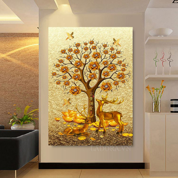 Tranh treo tường trang trí Hươu và Cây tài lộc thể hiện một cặp hươu màu vàng đứng dưới gốc cây tài lộc. Cây tài lộc nở đầy hoa, kết quả và rụng xuống những thỏi vàng óng ánh.