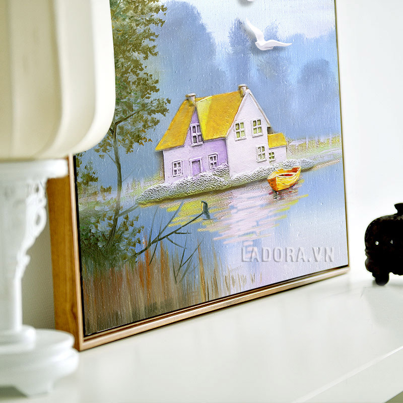 Bức tranh ngôi nhà bên hồ nước là một tác phẩm đầy sự tinh tế và lãng mạn. Bức tranh có thể được làm quà tặng sinh nhật , quà mừng tân gia , quà tặng sếp…rất đẹp và ý nghĩa.
