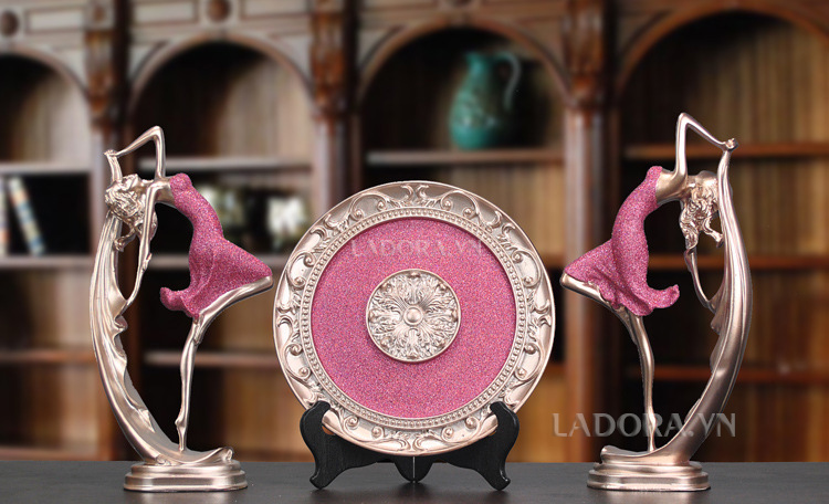 Các nàng mặc một chiếc váy dạ hội màu hồng tinh xảo và lộng lẫy. Trên đó điểm những những ánh kim lấp lánh trông thật nổi bật và đẹp đẽ. Đôi cô gái đặt hai bên chiếc đĩa thanh lịch tạo nên sự đối xứng cho một tác phẩm decor hoàn hảo. Dưới bàn tay khéo léo, tỉ mỉ của các nghệ nhân, chiếc đĩa là sản phẩm trang trí hết sức tinh tế. Và đặc biệt, chiếc đia cũng rất sang trọng với những đường viền hoa văn độc đáo, đẹp mắt.